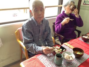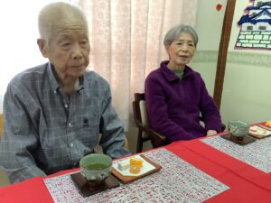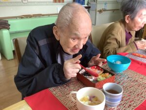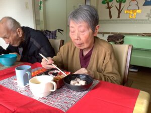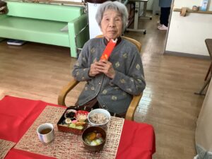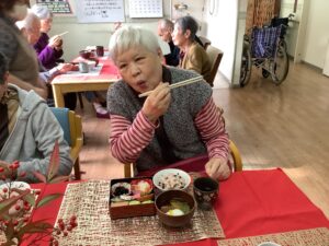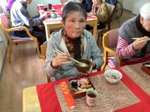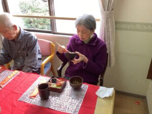 お昼におせちをご用意させていただき、黒豆やだて巻きなどおせちを見ると「うわぁ~ええがにしとってじゃね」ととても喜んで下さいました♪