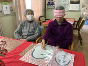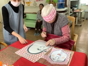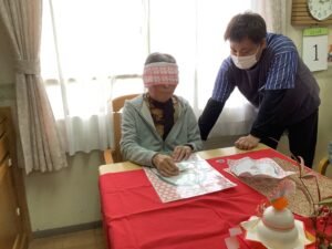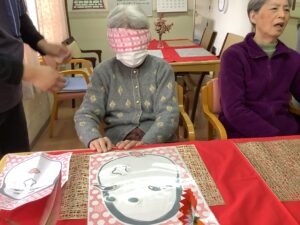 午後からは福笑いをさせていただき、皆様にも目隠しで参加をしていただくと「見えんけぇええがに出来ん」と言われ難しそうにされていましたが、完成品を見て「こがぁなのが出来たんじゃね」と笑っておられ楽しんでおられました♡