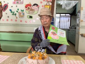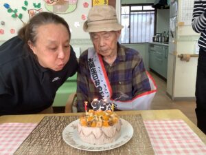 皆さんとバースデイソングを歌い、スタッフと一緒にケーキのロウソクを消されました。バースデイカードのプレゼントも大変喜ばれておられました。