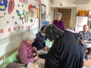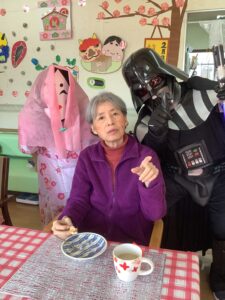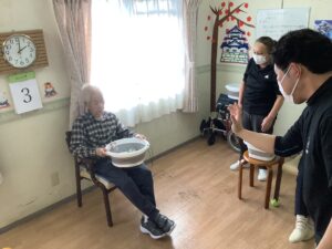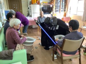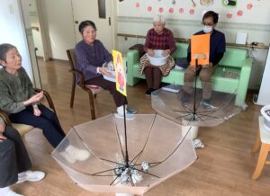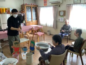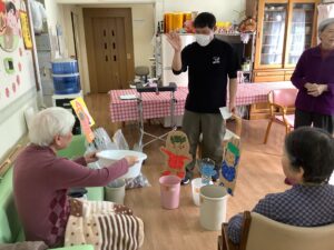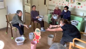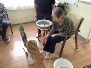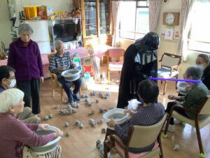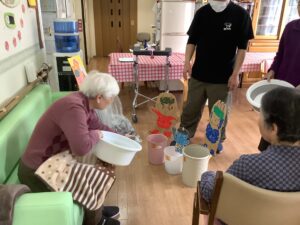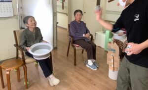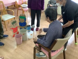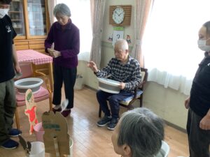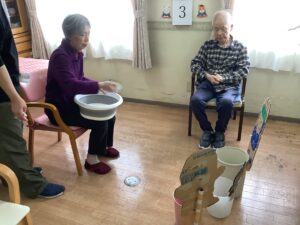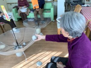 ちょっとしたミニゲーム感覚でスタッフが皆様に玉を投げ返すと容器を上手に動かして取っておられ、皆様楽しんで参加をして下さいました。