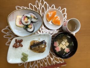 まずは、お昼ご飯には巻き寿司とイワシの梅煮を食べました🎵