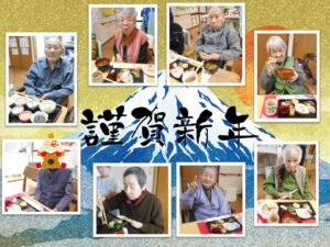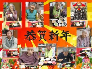 元日。お昼ご飯に”お正月祝い善”をご用意しました。GH1階と2階の利用者様ご一緒に、お正月のお祝いとお食事を楽しまれました。