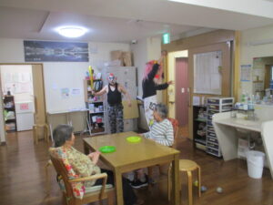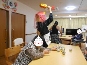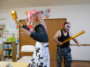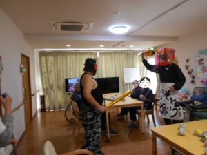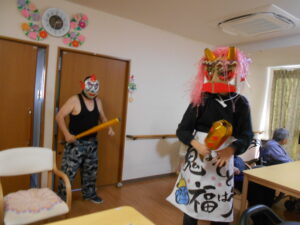 こんにちは。錦帯橋GHです。今年も節分の日に、錦帯橋みどりの家に、赤鬼、青鬼がやってきました。傍若無人に、GH(1・2階)から小規模(3階)を暴れまわりました。※プロレスラー風に化けている鬼もいます。