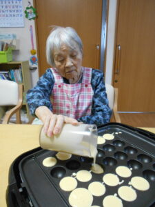 タコ焼き用のプレートでカステラを焼いていきます。上手にプレートの上をコロコロ転がして、まるく作るのが難しい。