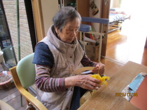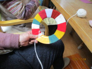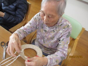 紙皿の真ん中を切り抜いて好みの毛糸をきれいに巻きつけます。